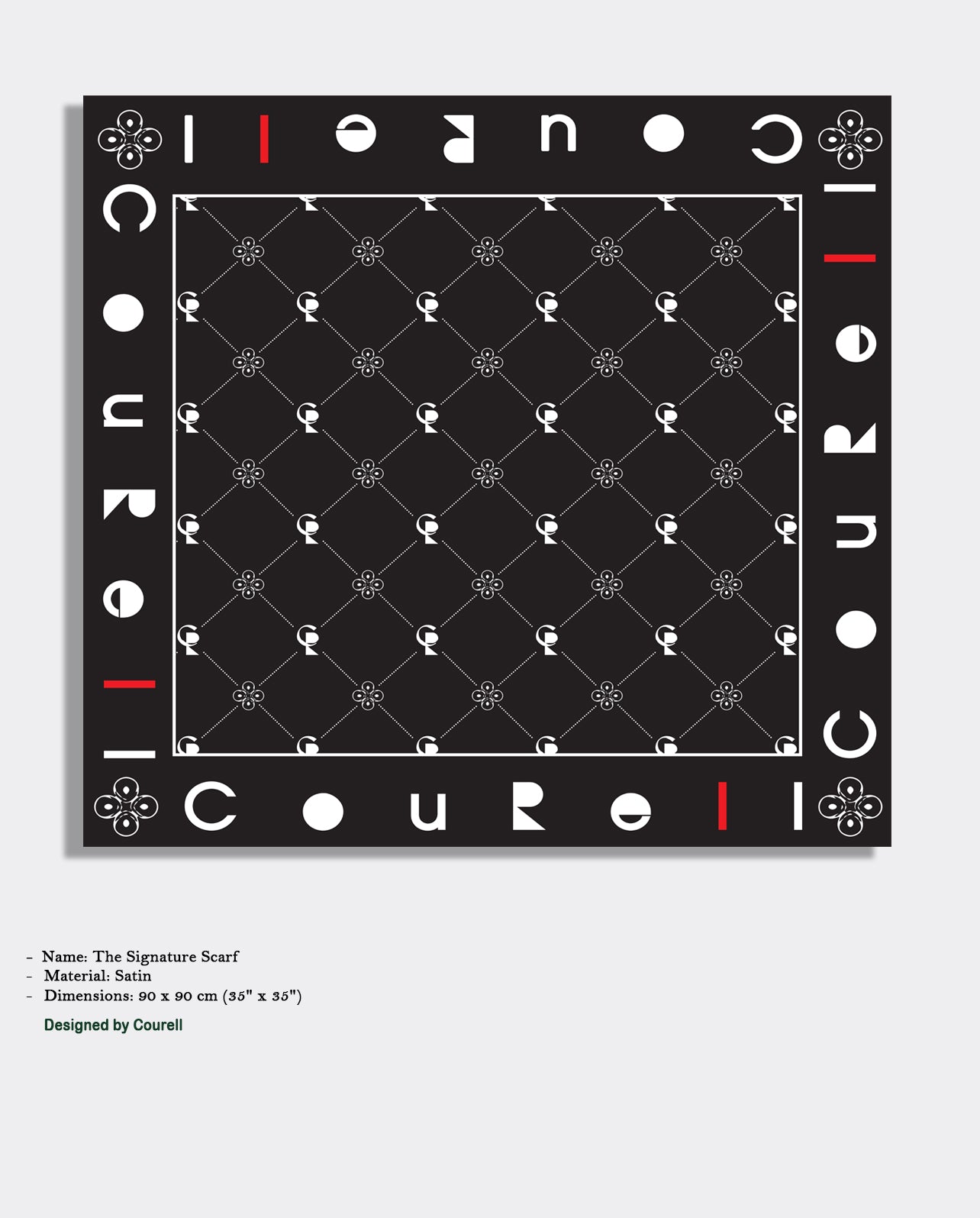 The Signature Scarf is a refined square of modern elegance, crafted in high-gloss satin and patterned with Courell’s custom monogram in a repeating, geometric grid. Framed by a bold black border with deconstructed logo lettering and signature red bars, this scarf is a statement of quiet authority and elevated taste.